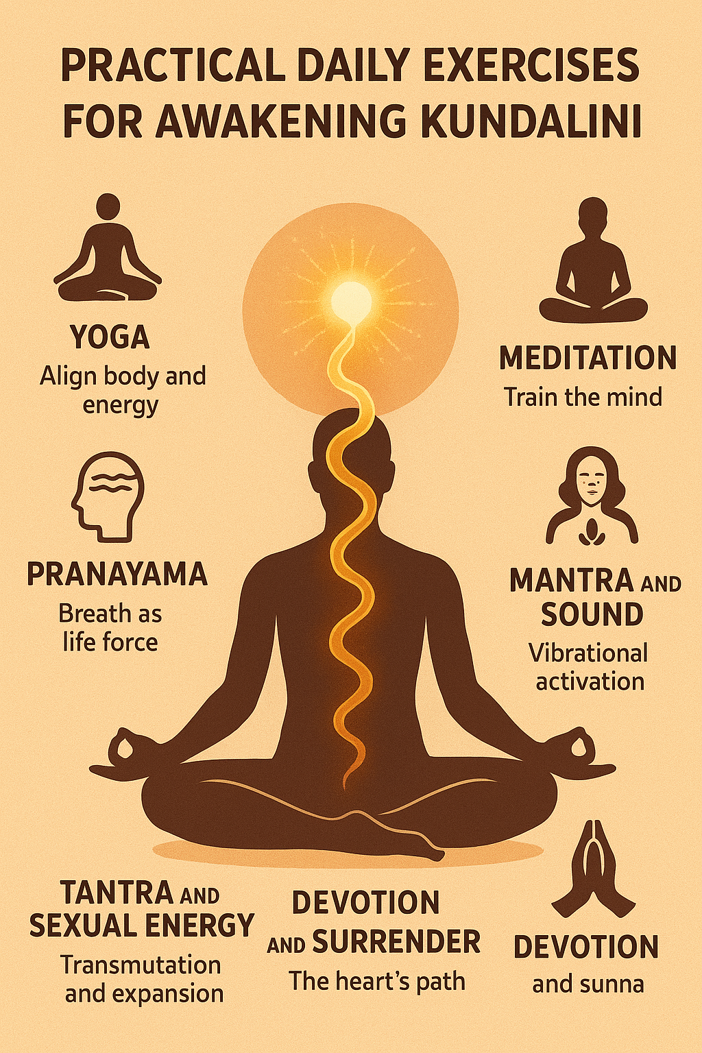 Kundalini is not achieved through a single method but through a holistic alignment of body, mind, breath, sound, energy, and heart. Each discipline — yoga, meditation, pranayama, mantra, tantra, and devotion — represents a pathway into the same living current. When practiced together, they awaken the serpent safely, cultivate wisdom, and integrate spiritual illumination into daily life.